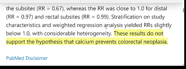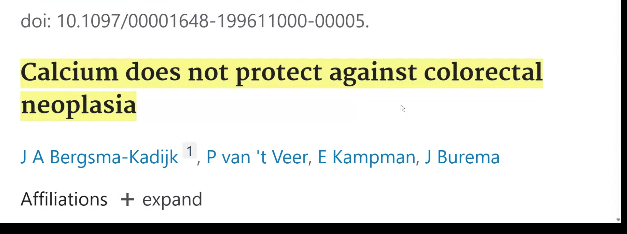 Calcium does not protect against colorectal neoplasia – PubMed: https://pubmed.ncbi.nlm.nih.gov/8899384/