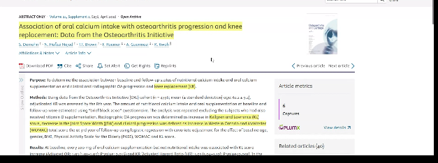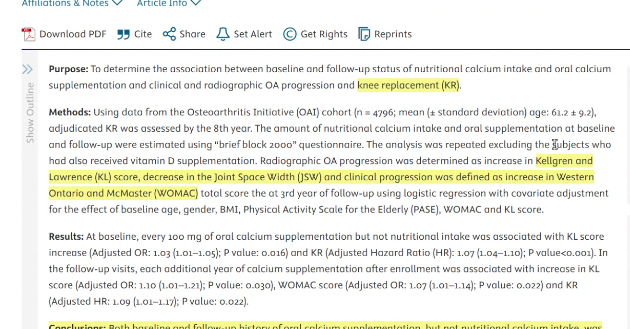 Association of oral calcium intake with osteoarthritis progression and knee replacement: Data from the Osteoarthritis Initiative – Osteoarthritis and Cartilage: https://www.oarsijournal.com/article/S1063-4584(16)00506-9/fulltext