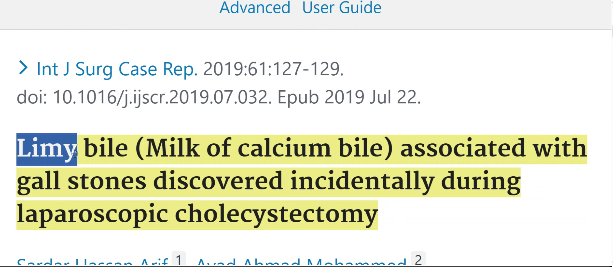 Limy bile (Milk of calcium bile) associated with gall stones discovered incidentally during laparoscopic cholecystectomy – PubMed: https://pubmed.ncbi.nlm.nih.gov/31357104/