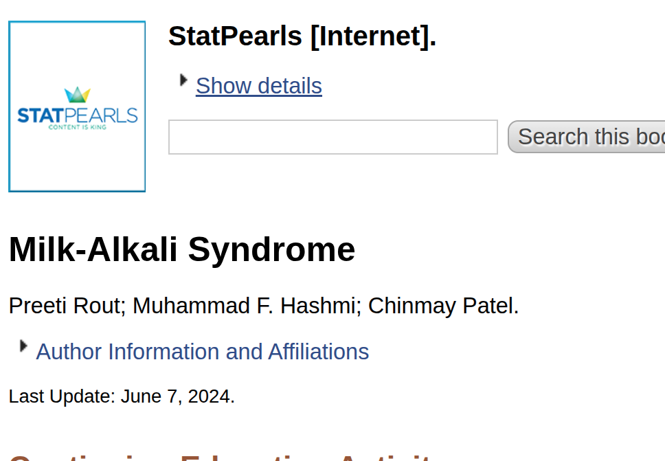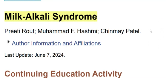 Milk-Alkali Syndrome – StatPearls – NCBI Bookshelf: https://www.ncbi.nlm.nih.gov/books/NBK557500/