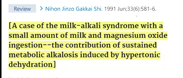 [A case of the milk-alkali syndrome with a small amount of milk and magnesium oxide ingestion–the contribution of sustained metabolic alkalosis induced by hypertonic dehydration] – PubMed: https://pubmed.ncbi.nlm.nih.gov/1920938/