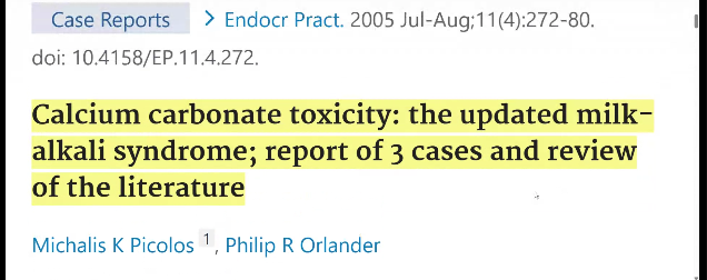 Calcium carbonate toxicity: the updated milk-alkali syndrome; report of 3 cases and review of the literature – PubMed: https://pubmed.ncbi.nlm.nih.gov/16006300/