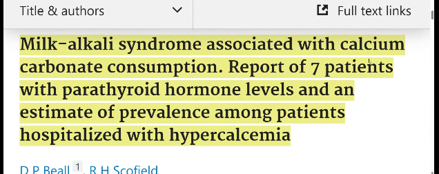 Milk-alkali syndrome associated with calcium carbonate consumption. Report of 7 patients with parathyroid hormone levels and an estimate of prevalence among patients hospitalized with hypercalcemia – PubMed: https://pubmed.ncbi.nlm.nih.gov/7891547/