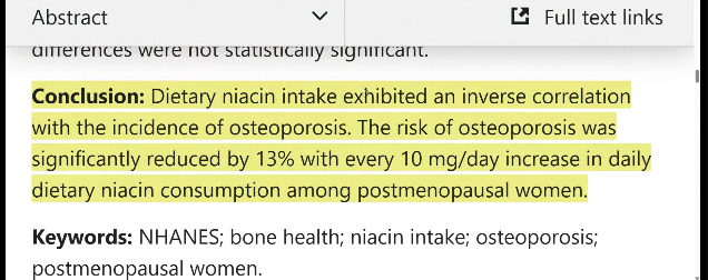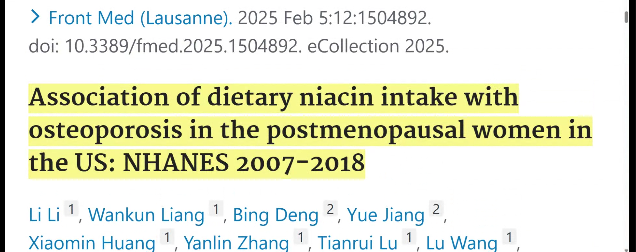Association of dietary niacin intake with osteoporosis in the postmenopausal women in the US: NHANES 2007-2018 – PubMed: https://pubmed.ncbi.nlm.nih.gov/39975675/
