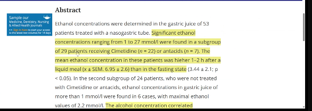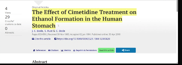 - The Effect of Cimetidine Treatment on Ethanol Formation in the Human Stomach: Scandinavian Journal of Gastroenterology: Vol 19, No 6: https://www.tandfonline.com/doi/abs/10.1080/00365521.1984.12005820