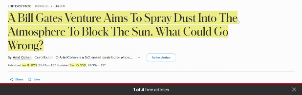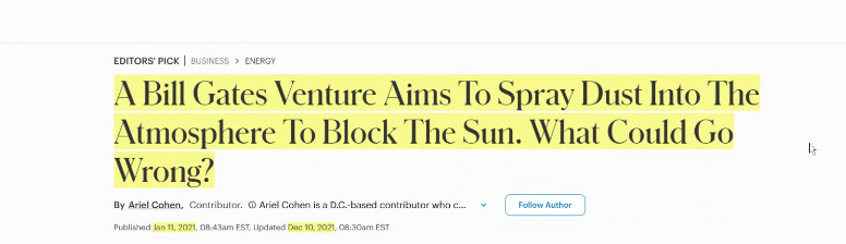 A Bill Gates Venture Aims To Spray Dust Into The Atmosphere To Block The Sun. What Could Go Wrong?: https://www.forbes.com/sites/arielcohen/2021/01/11/bill-gates-backed-climate-solution-gains-traction-but-concerns-linger/